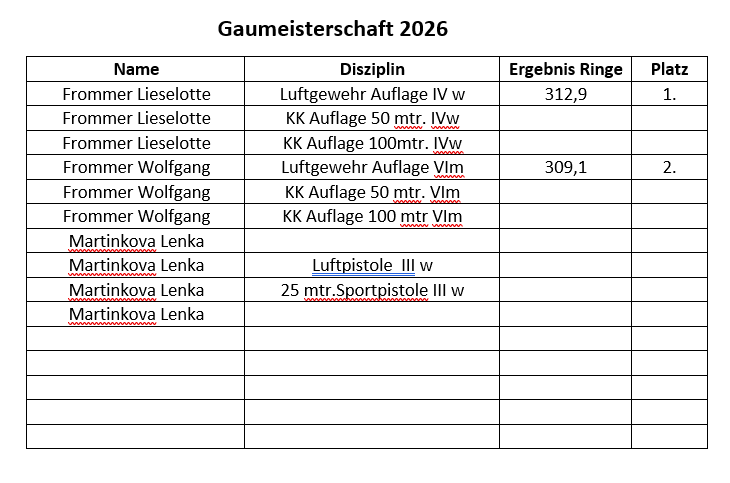 Die Gaumeisterschaften sind nach den Vereinsmeisterschaften die Basis für die Bezirksmeisterschaften des Schützenbezirks Oberpfalz zur Landesmeisterschaft Bayern bis zu den Deutschen Meisterschaften.